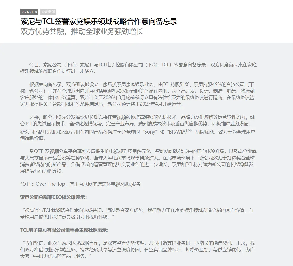 Sony公司與 TCL 電子控股有限公司正式簽署意向備忘錄,宣佈將聯手開合資公司,整合雙方在家庭娛樂領域的資源優勢。新公司由 TCL 持股 51%、Sony持股 49%,預計 2027 年 4 月起全面運營,涵蓋電視及家庭音響產品的開發、製造、銷售等全鏈條業務,產品將繼續沿用 Sony 旗下「Sony」和「BRAVIA」知名品牌。