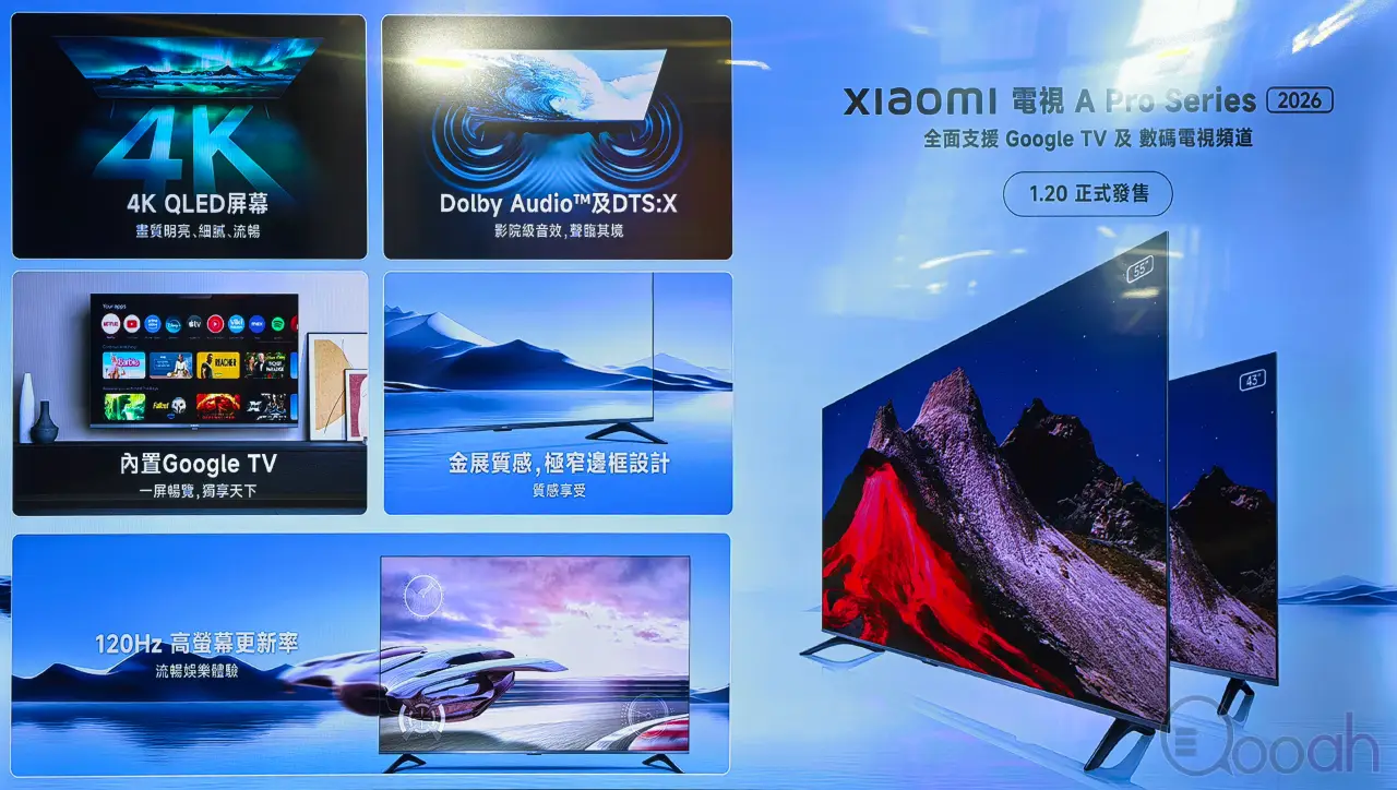 Xiaomi 電視A Pro 2026 將於1月20日正式發售,號稱可以全面升級家庭娛樂體驗。A Pro 2026提供 43吋 與 55 吋 兩種尺寸,均採用金屬極窄邊框設計,配備 4K QLED 屏幕,支援 UHD 4K 解析度、HDR10+、MEMC 及電影製片人模式(Filmmaker Mode),確保畫面細節豐富、色彩精準,在不同光線環境下仍能呈現鮮明影像。其中 55吋機型更支援 DLG 技術實現 120Hz 高刷新率,帶來流暢且反應靈敏的遊戲體驗。