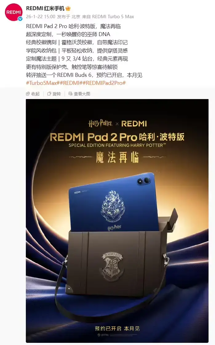 小米 REDMI 紅米手機官方微博再度官宣一款平板新品 —— REDMI Pad 2 Pro 平板哈利 · 波特版。