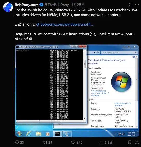 近期,Windows 愛好者、知名 Modder Bob Pony 創建了 Windows 7 和 Windows Vista 的 ISO 檔案,不僅可以直接安裝,還整合了所有必要的安全更新。