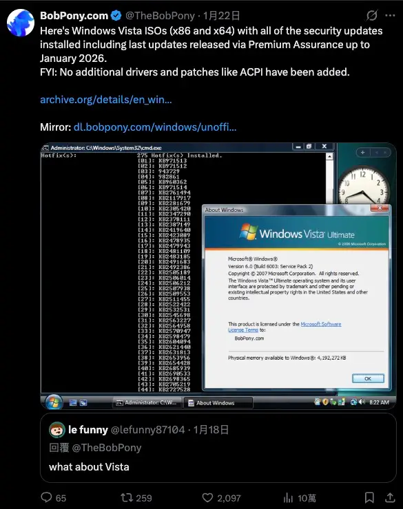 Bob Pony 鏡像中雖然包含 2026年1月 Vista 更新,但僅面向參與微軟高級保障計劃的付費客戶,所以普通用戶安裝後很可能會面臨黑客攻擊風險。