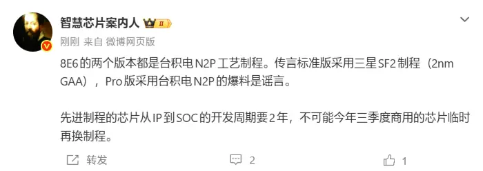 為了證明自己的觀點,博主強調先進製程的處理器從 IP 到 SOC 的開發週期需要2年時間,所以不可能存在今年第三季度推出的處理器臨時更換工藝製程。