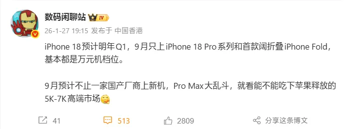 Apple 正計劃對其 iPhone 發佈策略進行重大調整。消息源 @數碼閒聊站 發文稱,「iPhone 18 預計在明年Q1,9月只上 iPhone 18 Pro 系列和首款闊摺疊 iPhone Fold,基本都是在萬元機檔位。9月預計不止一家國產廠商上新機,Pro Max 大亂鬥,就看能不能吃下蘋果釋放的 5K-7K 高端市場。」Apple 將從今年起轉為「一年兩發」的新節奏,以彌補上半年新機的空窗期,應對市場面臨的競爭壓力。