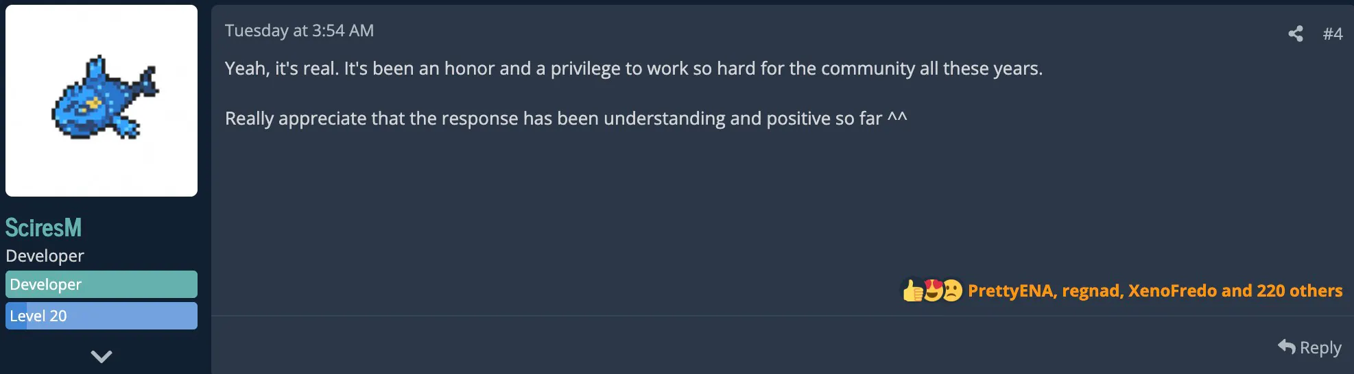 SciresM 在公告中表示,「大氣層」項目及 Switch 相關開發工作是自己傾注巨大心血的熱愛之作,能將人生多年時光奉獻其中深感榮幸。此次選擇退休,源於年齡增長帶來的時間分配變化,肩上的責任日益加重,個人生活也迎來新的轉折,尤其考慮到不久後將迎來孩子,不得不重新評估在業餘項目上的投入精力。他坦言自己秉持「要麼不做,要麼全力以赴」的性格,不願以「半退不退」的狀態敷衍項目,因此做出徹底退休的決定。