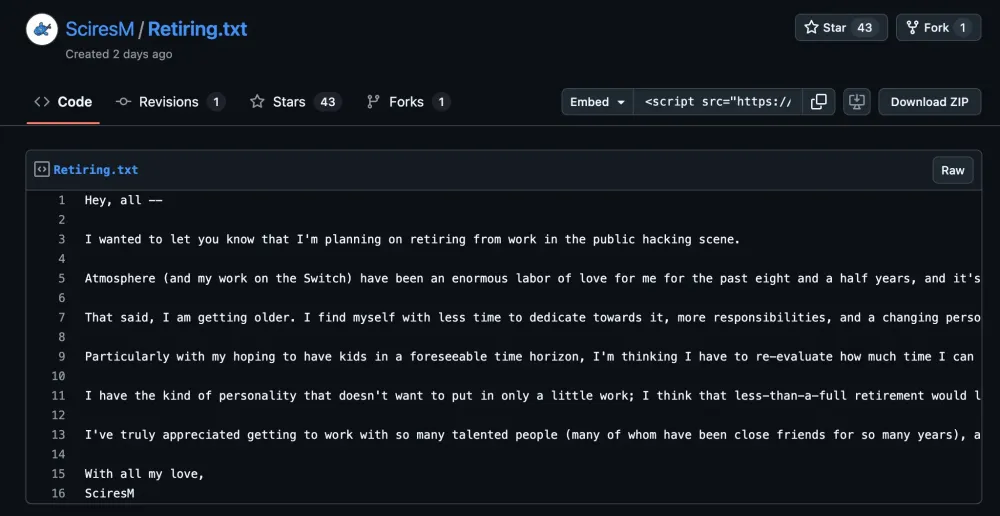 Switch 熱門定制固件「大氣層(Atmosphere)」 的作者 SciresM 通過 GitHub 發佈公告,正式宣佈從公開黑客圈退休,結束長達八年半的相關開發工作。