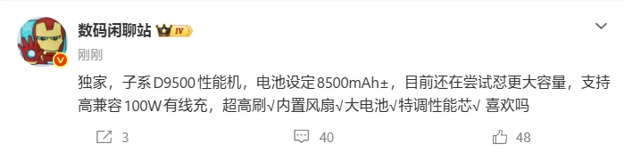 博主 @數碼閒聊站 爆料了一款天璣9500 旗艦手機的配置資料,猜測是小米旗下 REDMI K90 Ultra。