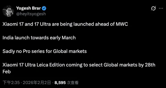 小米將於近期在全球市場推出其新一代旗艦手機。其中,Xiaomi 17 標準版預計在今年3月初之前率先在印度上市。而定位更高的 Xiaomi 17 Ultra LEICA 版,則計劃於2月28日面向全球正式發佈。