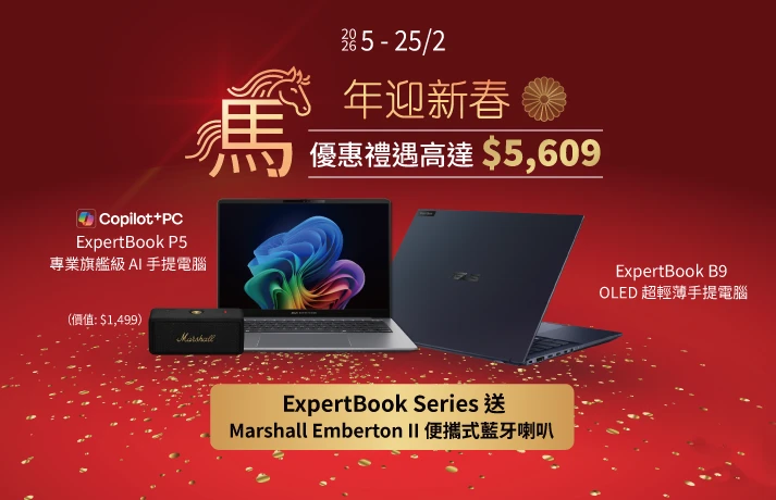新春優惠將於 2 月 5 日至 2 月 25 日期間限定登場,多款熱門 ExpertBook 型號推出罕見折扣,更以勁減高達 HK$4,110 的優惠回饋用戶。今年新春,ASUS 亦同步送上「好聲報喜」福氣 — 於活動期間選購全店任一 ExpertBook 即可獲贈時尚音響品牌 Marshall Emerton II 藍牙喇叭乙個(數量有限,送完即止)。