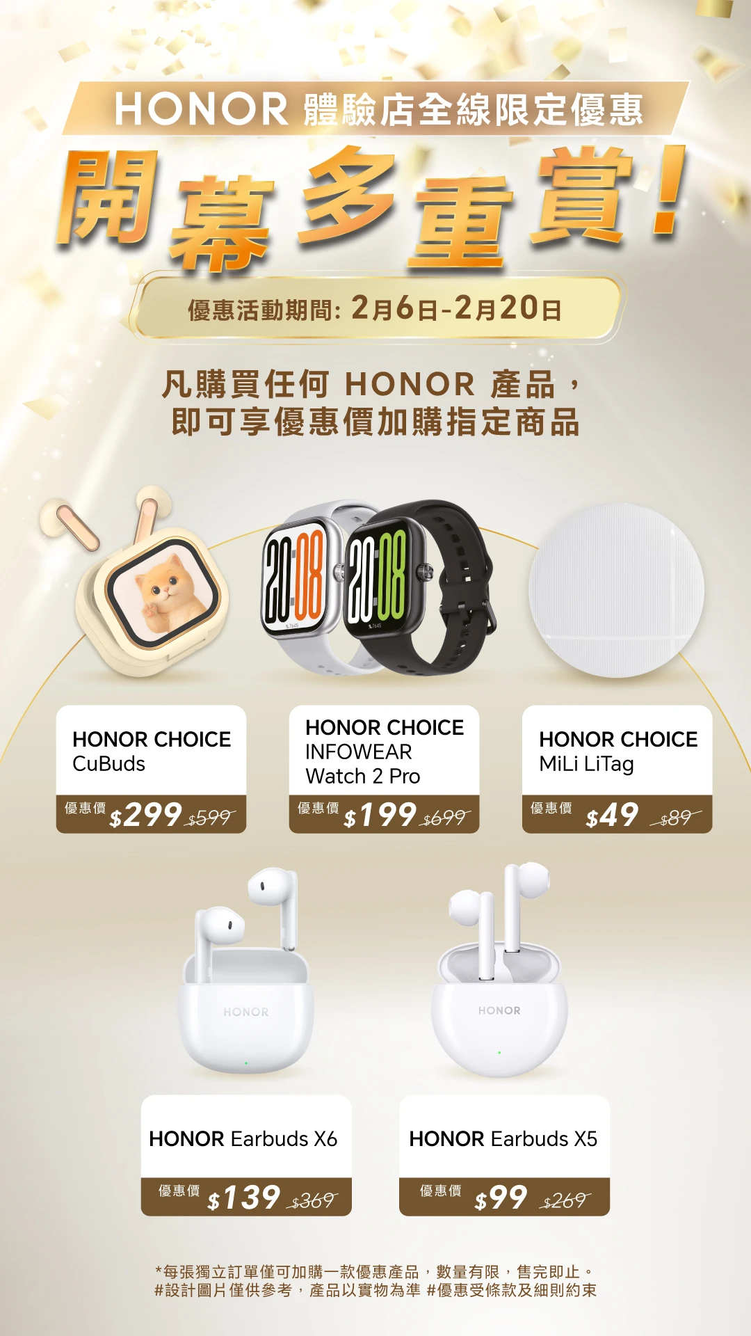 除葵芳新店外,自即日起至2月20日,HONOR 全港所有五間體驗店同步推出「開幕多重賞」及「即開即賞」活動。消費者於任何一間門店購買任何產品,即可享優惠價加購多款熱門配件,例如以 HK$299 加購 HONOR CHOICE CuBuds(原價HK$599),或以 HK$49 加購 HONOR CHOICE MiLi LiTag(原價HK$89)。