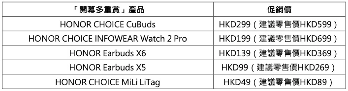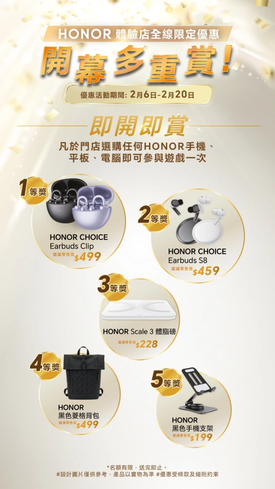 除葵芳新店外,自即日起至2月20日,HONOR 全港所有五間體驗店同步推出「開幕多重賞」及「即開即賞」活動。消費者於任何一間門店購買任何產品,即可享優惠價加購多款熱門配件,例如以 HK$299 加購 HONOR CHOICE CuBuds(原價HK$599),或以 HK$49 加購 HONOR CHOICE MiLi LiTag(原價HK$89)。