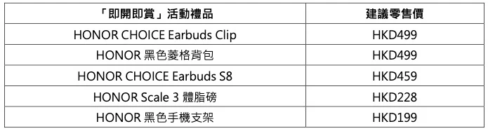 此外,活動期間購買任何手機、平板或電腦產品,即可參與「即開即賞」抽獎,有機會獲得 HONOR CHOICE Earbuds Clip(價值HK$499)、HONOR 黑色菱格背包(價值HK$499)等精選禮品,數量有限,送完即止。