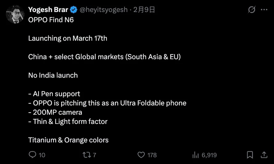 有海外消息人士透露,OPPO 新一代摺疊屏旗艦 Find N6 將於 3 月 17 日正式發佈,這款新機將主打輕薄設計與 2 億像素影像,還將帶來多項核心升級。該機將登陸中國、南亞及歐盟市場,暫未規劃印度市場的推出計劃。