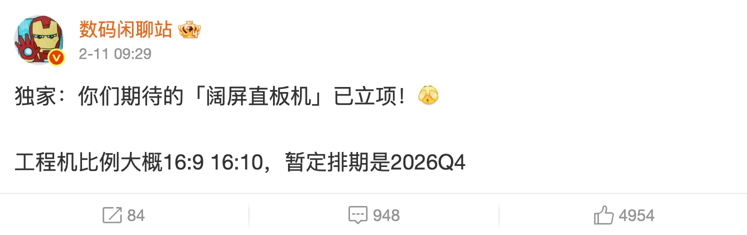 博主 @數碼閒聊站 表示,備受消費者關注的 HUAWEI「闊屏直板機」已經正式立項。其工程機的屏幕比例約為 16:9 或 16:10,預計會在 2026年第四季度發佈。