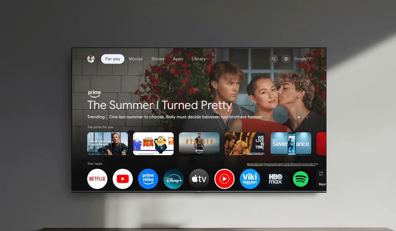 該電視搭載了原生的 Google TV 系統,內置了 Netflix、Prime Video、YouTube 等主流流媒體應用。同時,它也支援 Apple AirPlay、Google Cast 投屏協議以及 Google 助手語音控制,方便用戶無縫串流裝置內容。此外,Filmmaker Mode(製片人模式)的加入,可以保留電影原汁原味的畫面質感。