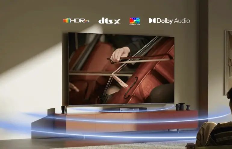 音頻部分,該電視內置雙 15W 揚聲器單元,並支援 Dolby Atmos(杜比全景聲)與 DTS:X 技術,為用戶營造沈浸式的三維空間音場,從清晰對白到澎湃音效,力求達到影院級的聽覺平衡。