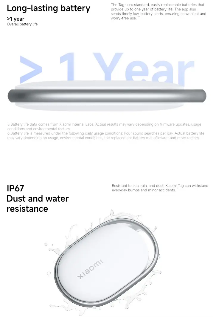 Xiaomi Tag 厚度控制在了 7.2mm,依然採用了常見的 CR2032 紐扣電池供電,官方宣稱續航最長可達一年。它搭載了藍牙5.4 技術並支援 NFC 功能,最大的看點在於其定位網絡的兼容性:同時接入了 Android 的 Find Hub 和 Apple 的 Find My 兩大尋找系統。