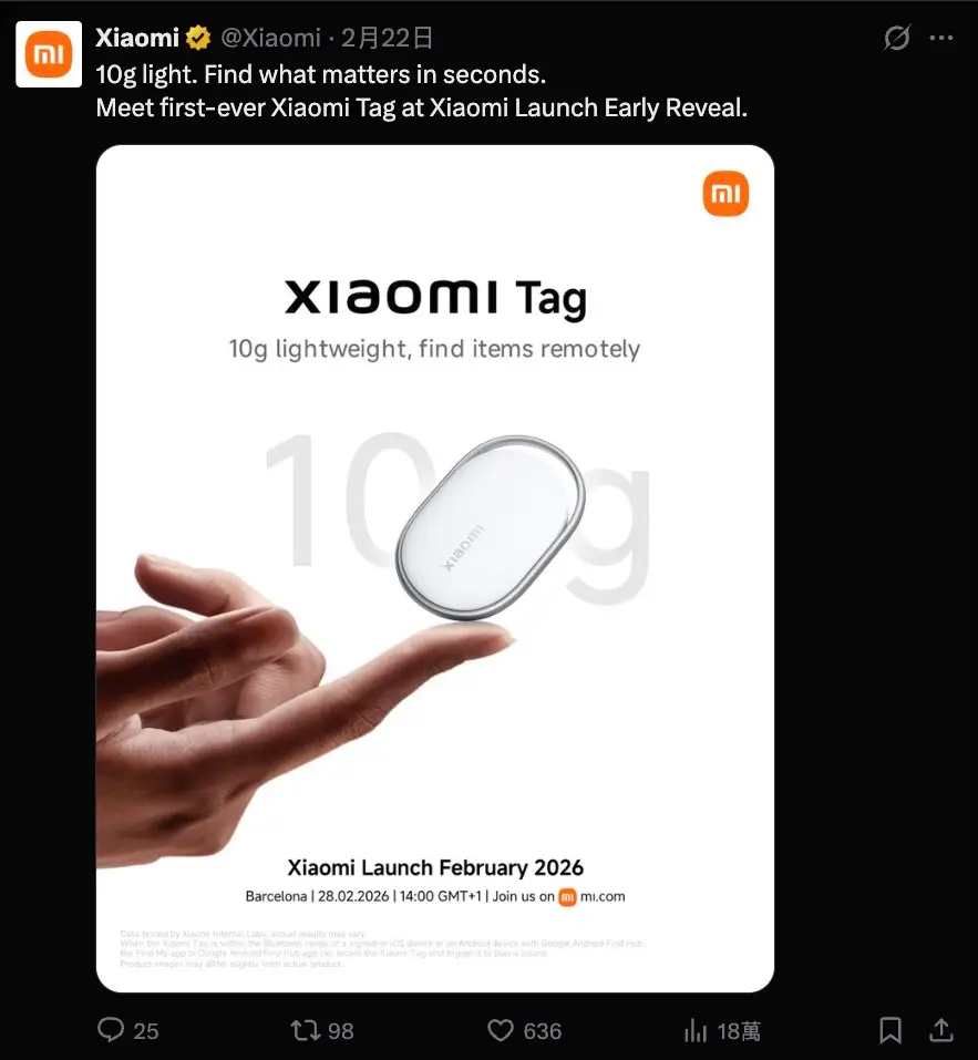 小米海外官方帳號預熱,小米 Xiaomi Tag 將於2月28日在海外市場迎來首發登場。屆時,它將與小米17 系列等一眾新品同台亮相。