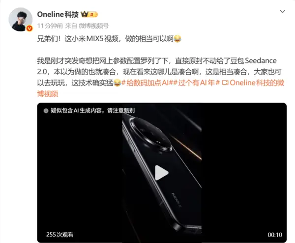 消息源數碼博主 @Oneline科技 表示,其將網上的規格參數羅列給豆包 Seedance 2.0,做出了一段 Xiaomi MIX 5 新機的渲染片。影片顯示 Xiaomi MIX 5 的外觀為直屏,後置圓形 Deco,搭載四個鏡頭,風格與之前的 MIX系列類似,這次還支援外掛鏡頭。