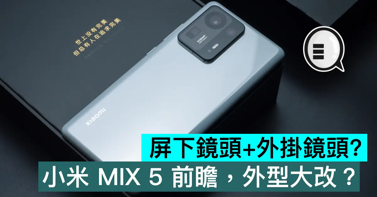 影像方面,暫未有非常明確的參數,網傳多個版本,較早網傳的版本 Xiaomi MIX 5 應為三鏡頭組合,主鏡可能為 1.08億像素,自由曲面廣角鏡頭為 1300萬像素,潛望式長焦為 800萬像素;最新的網傳版本表示 Xiaomi MIX 5 支援高倍率光學變焦的後置多鏡影像系統,或增加了可支援外接磁吸式專業鏡頭的技術等。
