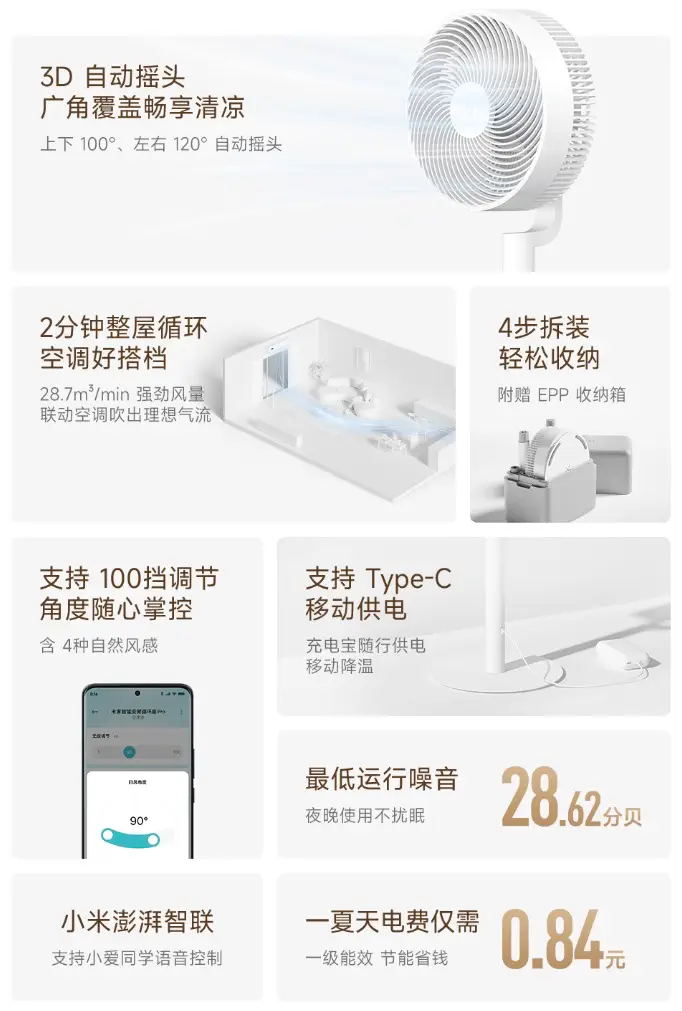 規格方面,風扇支援快拆收納,4步拆卸,便於換季存放,配備了 USB-C 接口,風扇支援 PowerBank 供電,最低運行噪音 28.62分貝,風扇為一級效能,一夏天電費最平僅需0.84元。作為一款智能家居設備,支援通過米家 App進行遠程控制,方便用戶隨時操控。