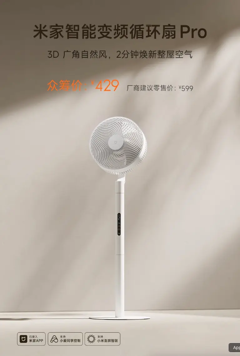 小米旗下有品平台正式上架了一款風扇新品——智能變頻循環扇Pro,將於 3 月 4 日開啓眾籌,眾籌價為 429 元人民幣(下同),建議零售價為599元。