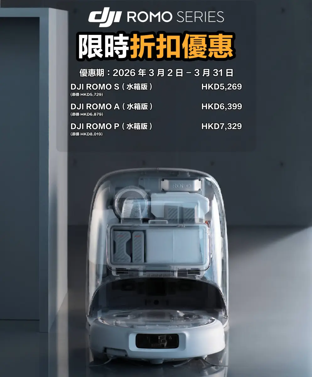 DJI 正式宣佈旗下第一款掃地機器人 ROMO 系列在香港市場推出,將有 DJI ROMO S、ROMO A 及 ROMO P 三個型號(均是水箱版本),即日起到3月1日開放預售,並提供限時優惠價。產品將於3月2日正式上市,優惠期截止到3月31日。