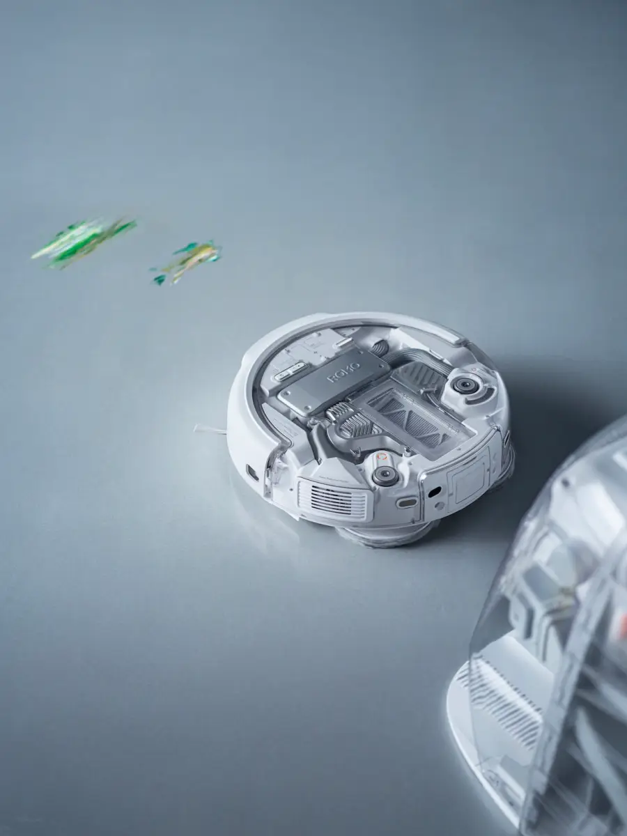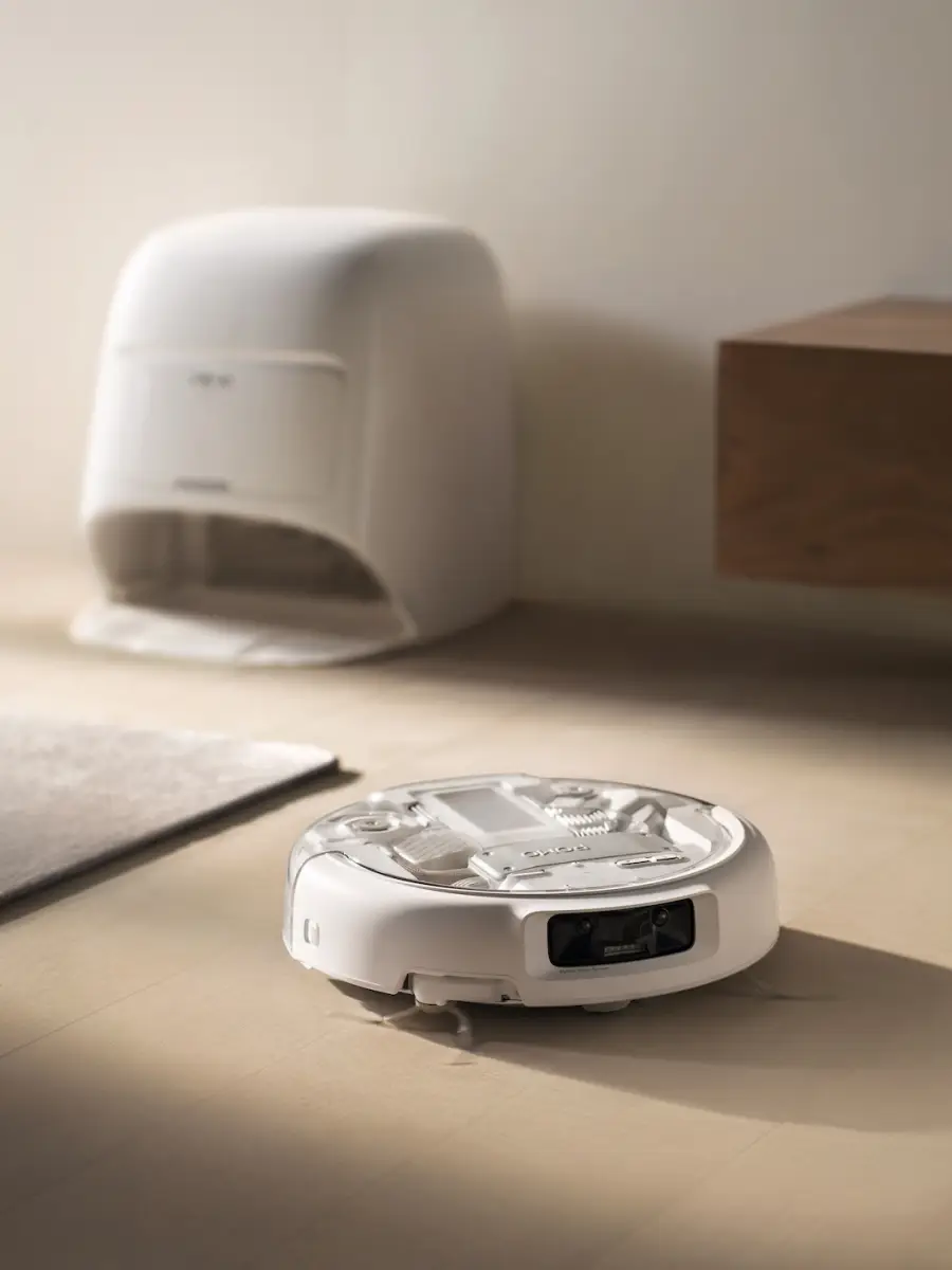 ROMO P 的基地台使用了創新的模組化架構,透過「內外分區」和「透明化」讓產品的美觀和性能兼顧,機子內部集合了電控系統、降噪結構、集塵風道等關鍵部件,線材進行了隱藏;外部則有水箱、塵袋、清潔液等功能模組,還配備了一體成型拖布清潔系統。