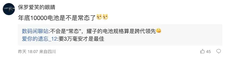 對於評論區關於「年底 10000mAh 電池是否成為常態」的提問,博主回應稱不會成為常態,並強調「耀子的電池規格算是跨代領先」。