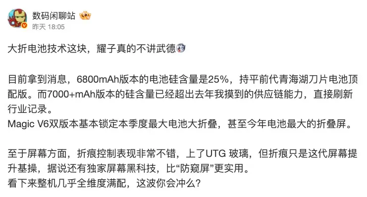綜合多位博主爆料,這款機型為 HONOR Magic V6。該產品將推出北斗版和常規版兩個版本,分別搭載 7150mAh 和 6850mAh 電池,成為本季度電池容量最大的大摺疊機型,甚至有望成為今年摺疊屏領域的「電池容量之王」。