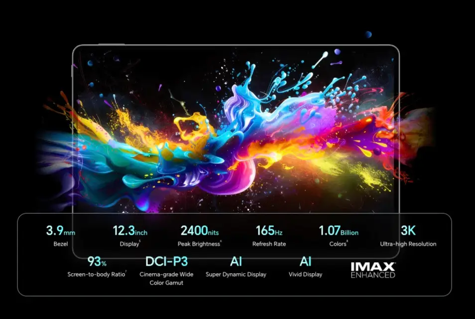 屏幕方面,MagicPad 4 搭載了 12.3吋 3K OLED 屏,解像度為 3000×1920,像素密度 290 PPI,支援 165Hz 高刷新率,HDR 亮度最高可達 2400nit,而且還兼容 DCI-P3 廣色域與 10.7億色顯示。