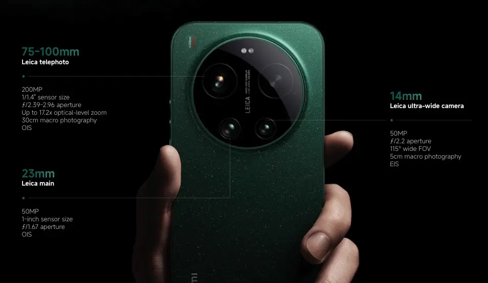 設計方面, Xiaomi 17 Ultra 提供黑色、白色及星辰綠色三款選擇,其中星辰綠色採用細膩礦物閃粉效果,黑白兩色則選用耐用複合玻璃纖維材料。