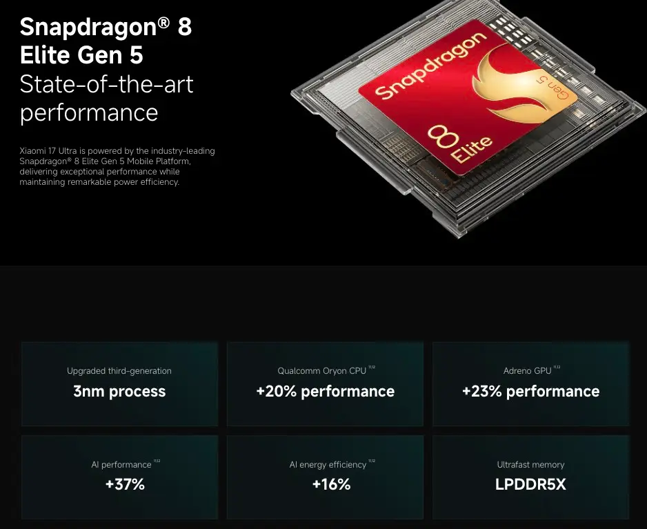 效能表現上, Xiaomi 17 Ultra 搭載最新 Snapdragon 8 Elite Gen 5 處理器,配備 16GB RAM 與 512GB ROM,輕鬆應對高強度多工作業。