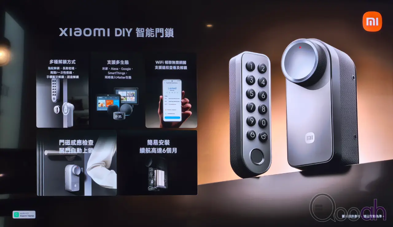 Xiaomi DIY 智能門鎖聚焦居家便捷與安全,配備指紋解鎖、長期密碼、週期 / 一次性密碼、手機藍牙、遠端解鎖及語音解鎖等多種解鎖方式,滿足不同居家使用場景。這款智能門鎖安裝操作簡便,無需鎖匠協助,15 分鐘內即可完成自主安裝,內置續航可支援最長 6 個月使用,搭配門磁感應 Door Sensor,能實時查看門體是否安全關閉,同時支援關門自動上鎖功能。系統適配性上,Xiaomi DIY 智能門鎖可連接 Mi Home App,接入 Matter 生態,兼容 Homekit、Alexa、Google、SmartThings 等主流智能平台,還能通過 WiFi 實現遠端查看與解鎖,無需網關即可操作,其建議零售價為 HK$879。