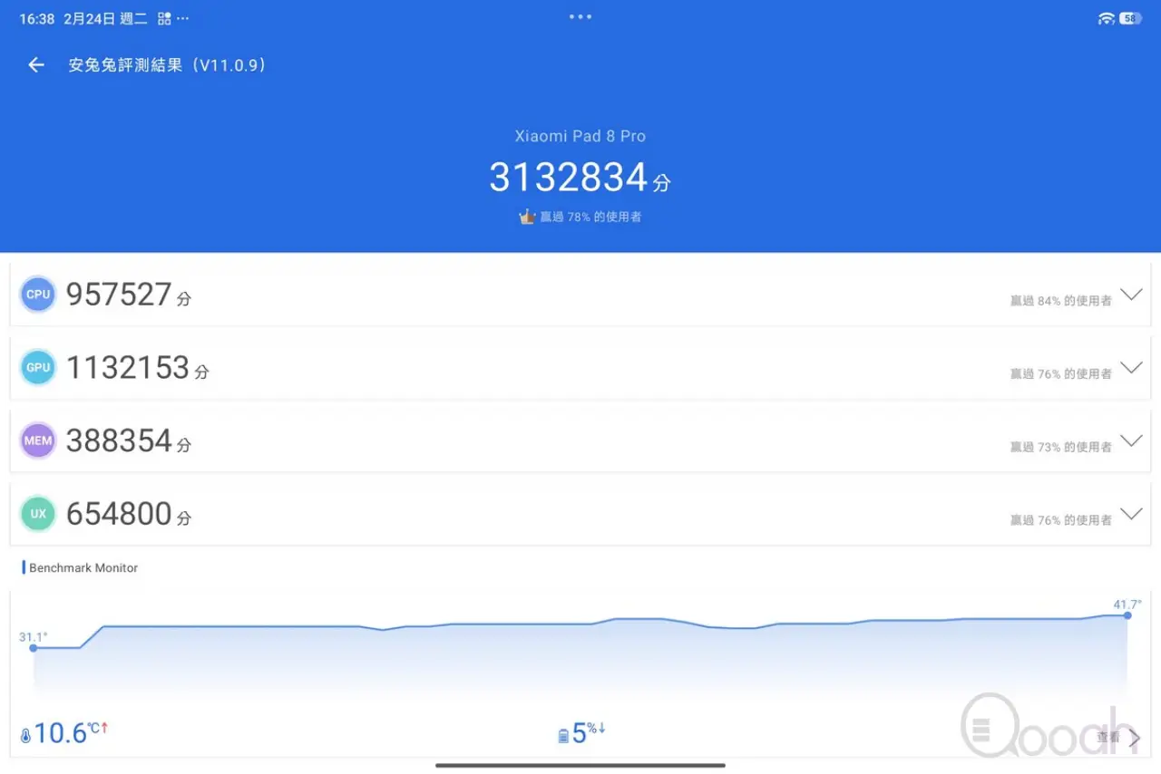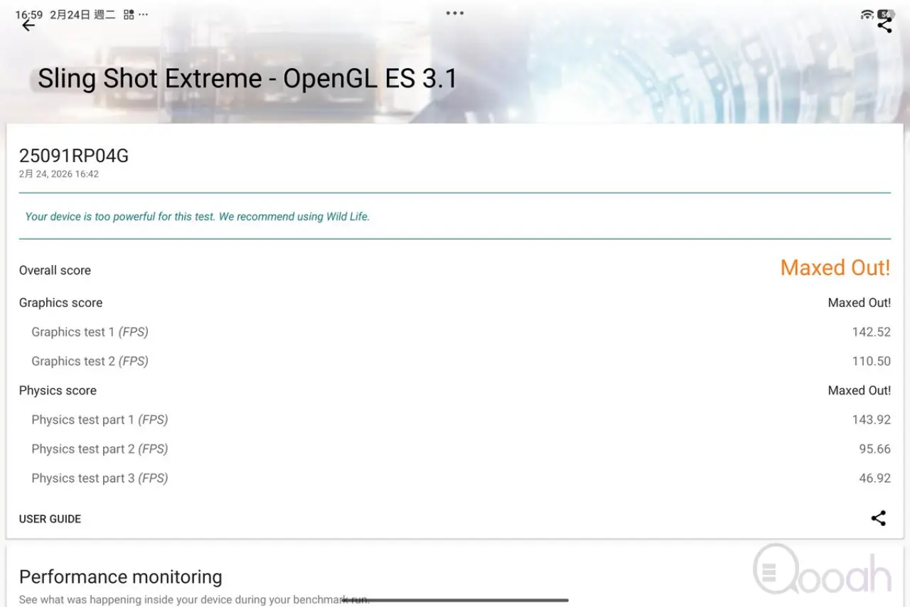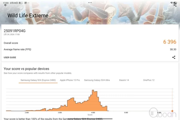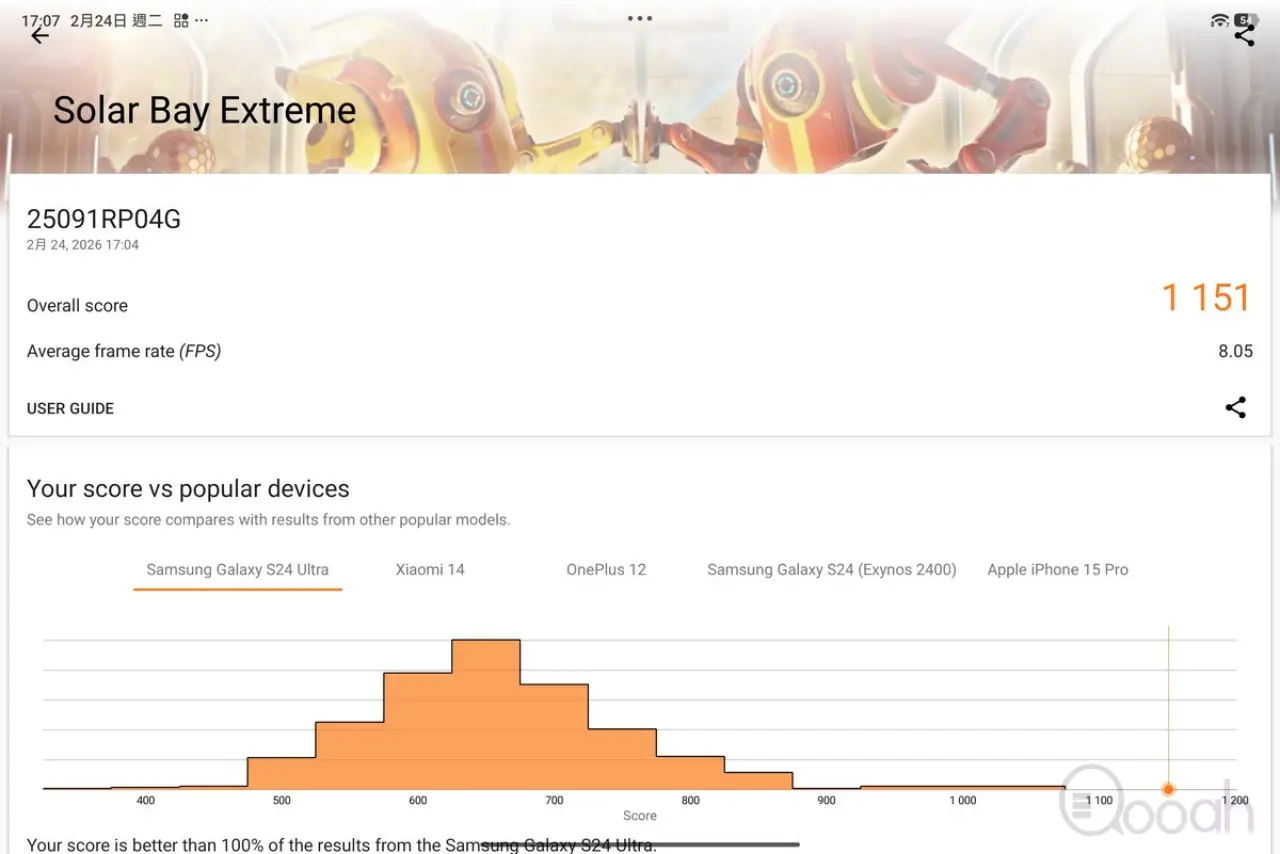 Xiaomi Pad 8 Pro 國際版搭載 Snapdragon 8 Elite CPU、8GB RAM、256GB ROM,Antutu 跑分 3132834 分,3D Mark Sling Shot Extreme、Wild Life Extreme 及 Solar Bay Stree Test 分別是 Maxed Out、6396 及 1151 分,即使此機只是應用去年 Qualcomm 旗艦級別的晶片,但用在散熱表現更出色的平板電腦,效能都獲得頂級的成績。