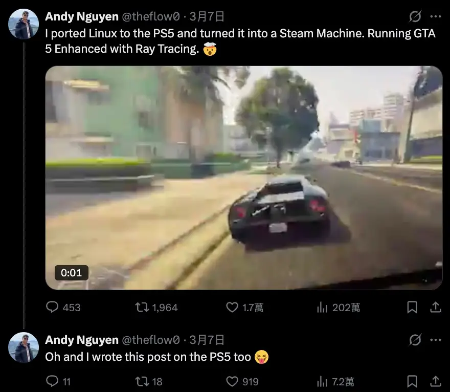 從公佈的影片來看,改造的裝置為 PS5 Slim 機型,能夠運行完整的 Linux 系統,功能無任何縮水。改造後不僅可以完成 PC 的常規操作,還能在 Steam 平台運行《GTA V 增強版》。該遊戲運行時的解像度為 1440p 穩定在,並開啓了「High RT」光線追蹤預設,幀數穩定在 60fps,基本沒有波動,音頻也正常播放。