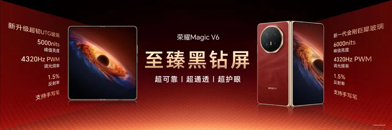 屏幕方面,HONOR Magic V6 採用全新至臻黑鑽屏,硬度更高,擁有耐高低溫特性。 HONOR 金鋼巨犀玻璃則是採用先進的抗反射高精鍍膜工藝,將抗反射膜與保護層相結合,擁有抗反射、耐摔、耐磨、耐刮等四重核心特性。