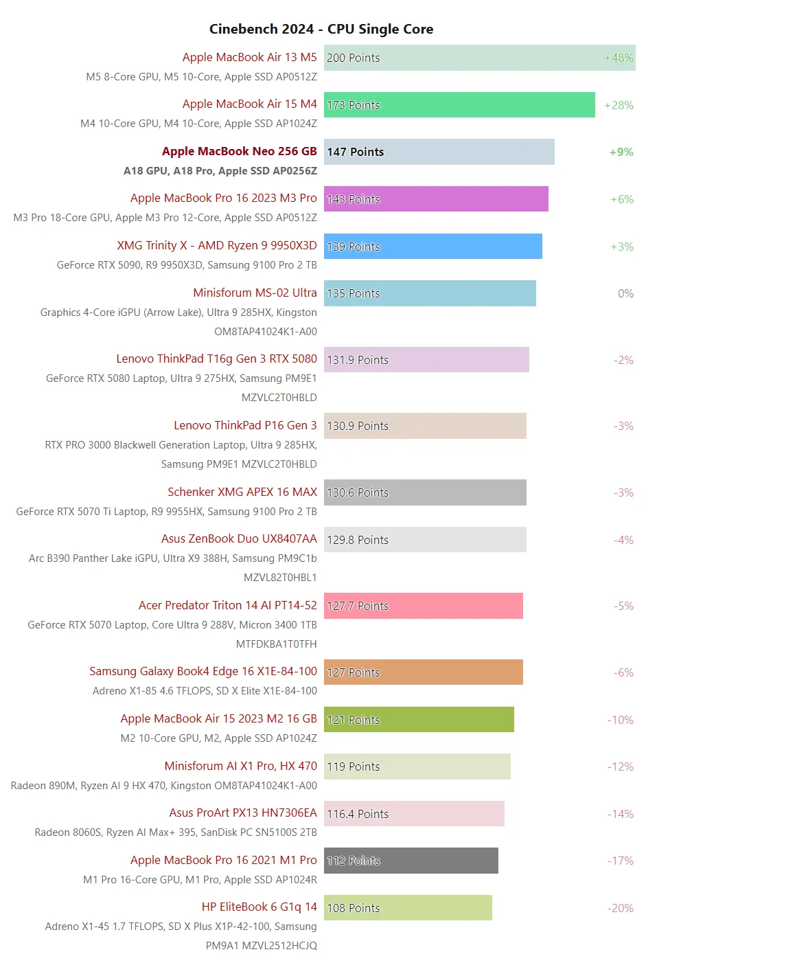 在單核性能層面,MacBook Neo 已超越現階段市面上所有主流的 x86 和 ARM 流動平台。