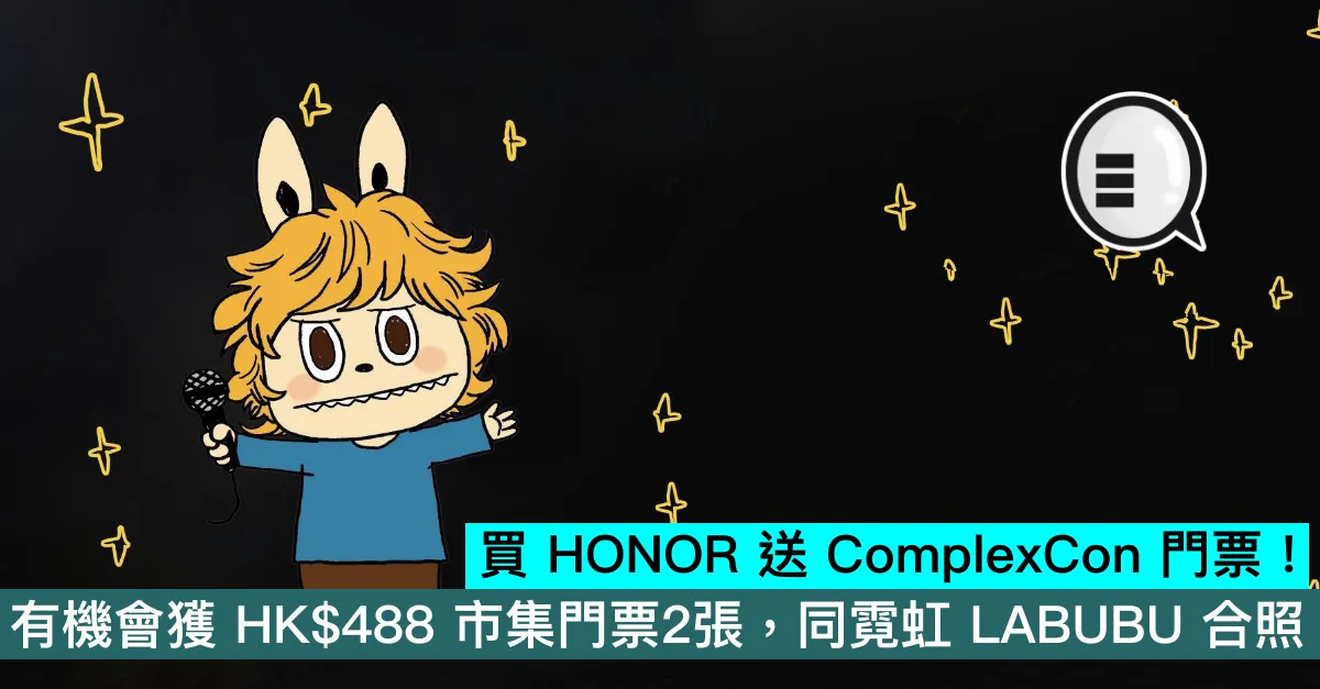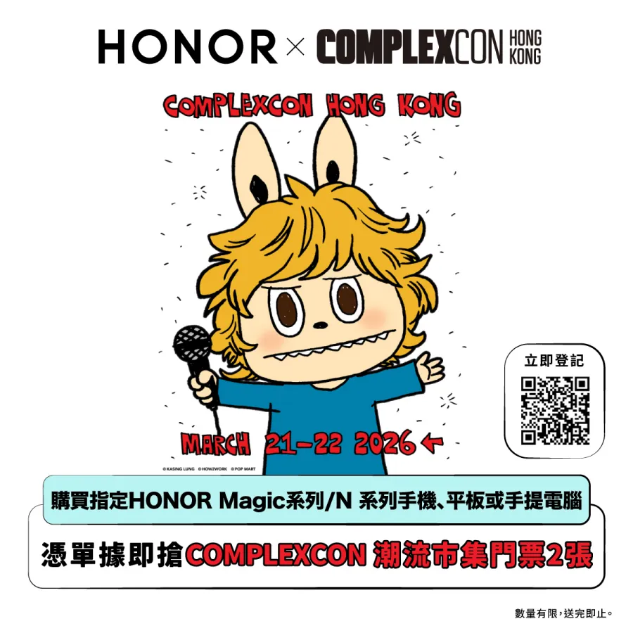ComplexCon 香港2026將於本月21日至22日在亞洲國際博覽館舉行,由 LABUBU 創作者龍家昇擔任藝術總監,勢必吸引大量潮流愛好者朝聖。HONOR 除了在 Complex Studio 提供沉浸式拍攝體驗外,更由即日起推出限時優惠,消費者於官方銷售點以正價選購指定型號手機、平板或手提電腦,包括Magic系列及N系列等產品,即可有機會獲贈 ComplexCon 潮流市集門票兩張,門票日子隨機發放,每日門票共20張,數量有限,送完即止。每張門票價值 HK$488,讓粉絲親身感受這場集合潮流、音樂與藝術的文化盛事。
