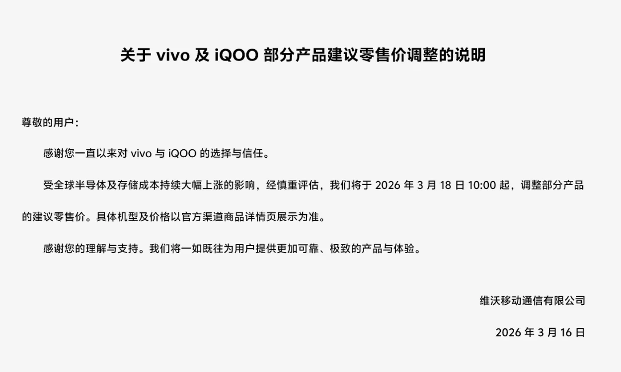 繼 OPPO 之後,vivo 今日也跟進調價。vivo 官網發佈公告稱,因上游產業鏈成本持續上揚,特別是存儲晶片等核心元器件供應緊張、價格上漲,公司決定於3月18日10:00起,對vivo及iQOO旗下部分產品的建議零售價進行上調。