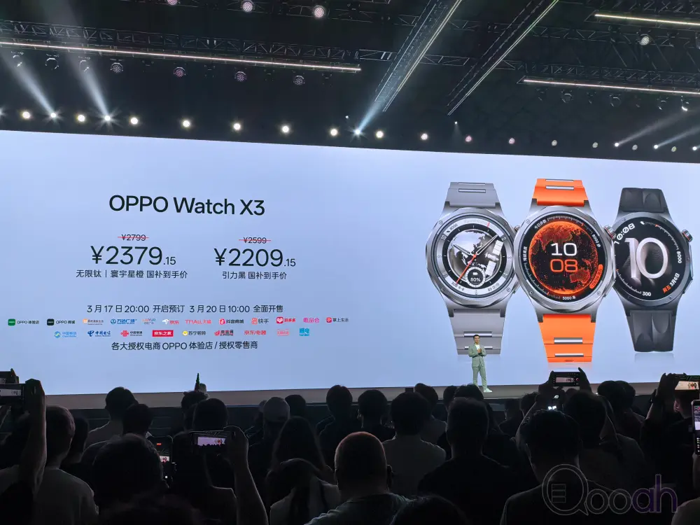 OPPO 今日發佈新款旗艦智能手錶 OPPO Watch X3,起售價 2599元。該手錶提供寰宇星橙、無限鈦、引力黑三種配色,採用全新十二邊形設計,錶殼由全鈦精工打造,整機重量減輕16%、厚度減薄6.4%。其中引力黑搭配氟橡膠錶帶,無限鈦和寰宇星橙則採用混合型氟橡膠錶帶。