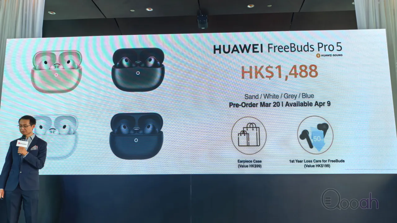 HUAWEI FreeBuds Pro 5 備有大地金、雪域白、冰霜銀及穹宇藍配色,建議零售價為 HK$1,488。3月20日起於指定零售商接受預訂,4月9日正式發售;指定零售商包括 HUAWEI 香港網上商店(consumer.huawei.com/hk/offer/)、HUAWEI 沙田新城市廣場體驗店、HUAWEI 九龍灣德福廣場體驗店、1010、csl.、3HK、3SUPREME、SmarTone、中國移動香港、中國電信澳門、澳門電訊、百老滙、豐澤、蘇寧、衛訊、中原電器及 CMK。