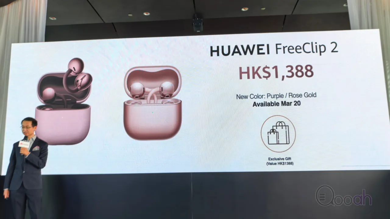 HUAWEI FreeClip 2 玫瑰金 及 冰莓紫配色,建議零售價為 HK$1,388,3月20日起於指定零售商正式發售;指定零售商包括 HUAWEI 香港網上商店(consumer.huawei.com/hk/offer/)、HUAWEI 沙田新城市廣場體驗店、HUAWEI 九龍灣德福廣場體驗店、1010、csl.、3HK、3SUPREME、SmarTone、中國移動香港、中國電信澳門、澳門電訊、百老滙、豐澤、蘇寧、衛訊、中原電器及 CMK。