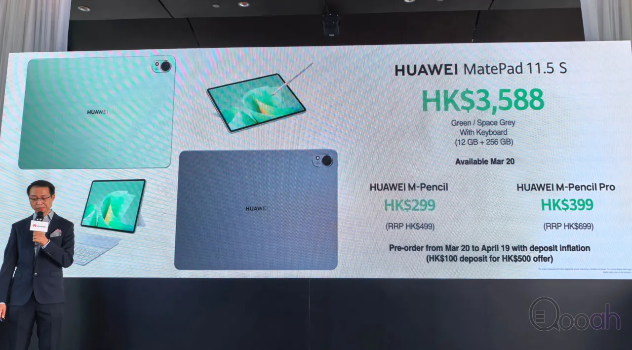 全新 HUAWEI MatePad 11.5 S (2026) 備有原野綠 及 深空灰配色,提供 12GB + 256GB 柔光屏版本,建議零售價為 HK$3,588。3月20日起於指定零售商發售;指定零售商包括 HUAWEI 香港網上商店(https://consumer.huawei.com/hk/offer/) 、HUAWEI 沙田新城市廣場體驗店、HUAWEI 九龍灣德福廣場體驗店、1010、csl.、中國移動香港、中國電信澳門、澳門電訊、百老滙、豐澤、蘇寧、衛訊、中原電器及 CMK。