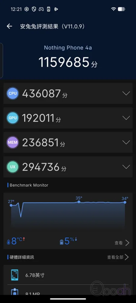 Nothing (4a) 設有 5080mAh 電量,支援 50W 充電,PCMark 使用時間測試成績為 19 小時 32 分鐘,有著十分出色的使用時間。