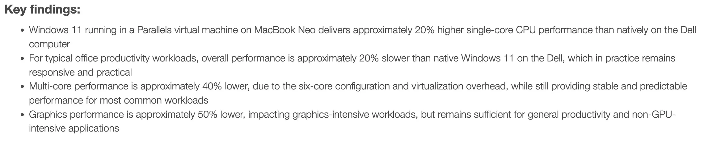 目前 Parallels Desktop 已實現對搭載 A18 Pro 處理器的 MacBook Neo 的完整支援。數據顯示,在運行單線程 Windows 程式時,Neo 的表現比採用 inter Core Ultra 5 235U 的 Dell Pro 14 快了大約20%。