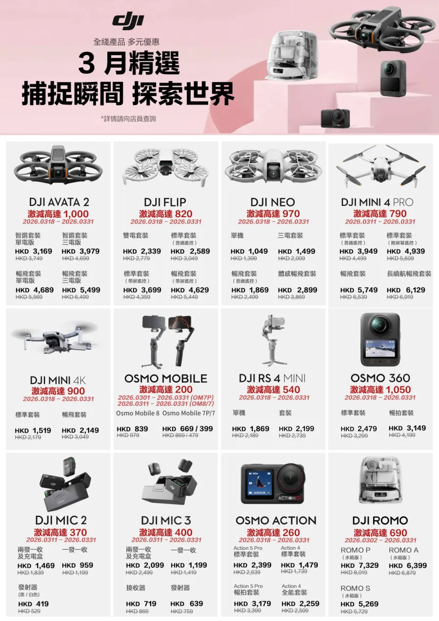 DJI 3 月限定優惠正式開啟,全線產品齊齊參與!從無人機、手持拍攝設備、收音 Mic、行動電源到專業拍攝系列,全新 DJI ROMO 亦同步享優惠。即日起至 3 月 31 日,讓各位愛好者以最吸引價格,盡情體驗 DJI 領先業界的創新科技。