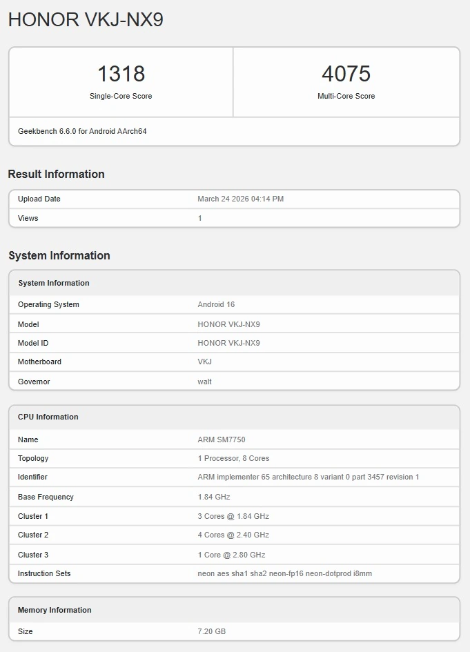 雖然 GeekBench 跑分頁面沒有標明處理器型號,但 CPU 型號「SM7750」指向高通 Snapdragon 7 Gen4 處理器。並且頁面資料顯示該機型至少會有 8GB 配置。