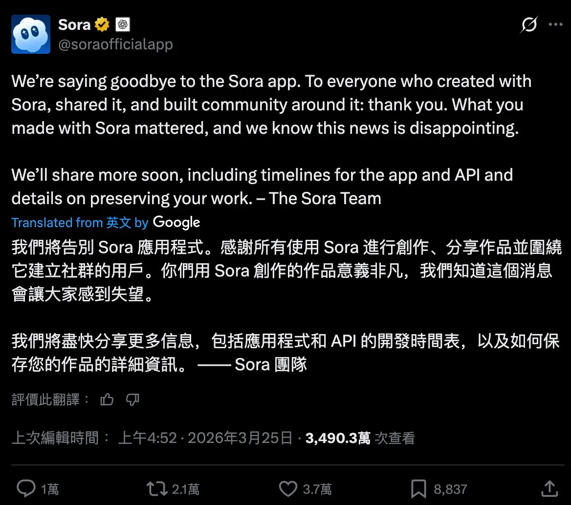 官方公告顯示,Sora 的消費者版本、開發接口以及 ChatGPT 相關功能將全部停止服務。開發團隊在社交平台上發文告別,表示會盡快公佈用戶作品的導出方式和服務終止的具體時間。團隊在致謝用戶的創作熱情之余,也坦言此舉讓人遺憾,但並未解釋背後的原因。