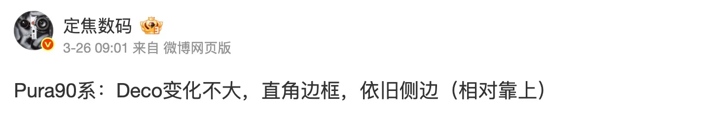 有博主透露,HUAWEI Pura 90系列的機身設計會沿用直角邊框設計,後置鏡頭模組形態設計基本不變。