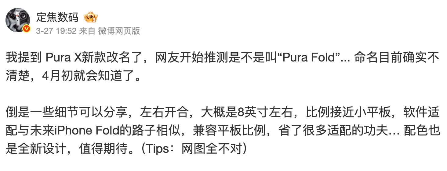 博主 @定焦數碼 透露,華為下月發佈的全新 Pura X 機型不會再沿用之前的命名方式,意味著不會被稱為 Pura X2。具體的名稱華為尚未公佈。